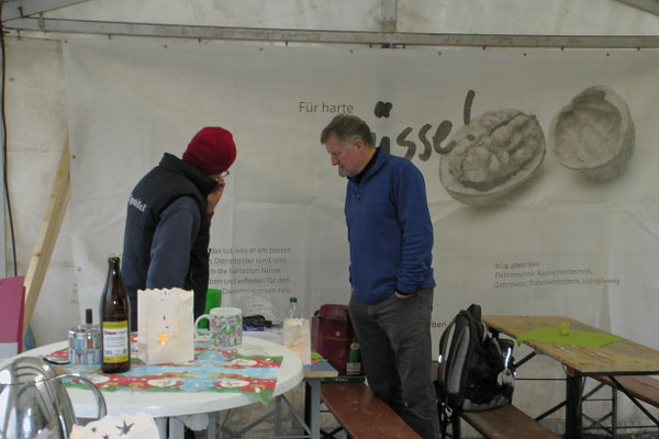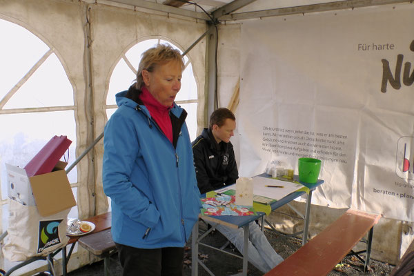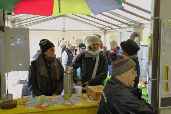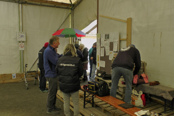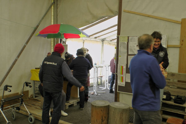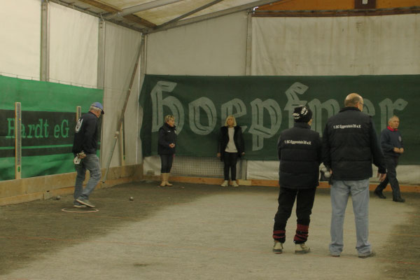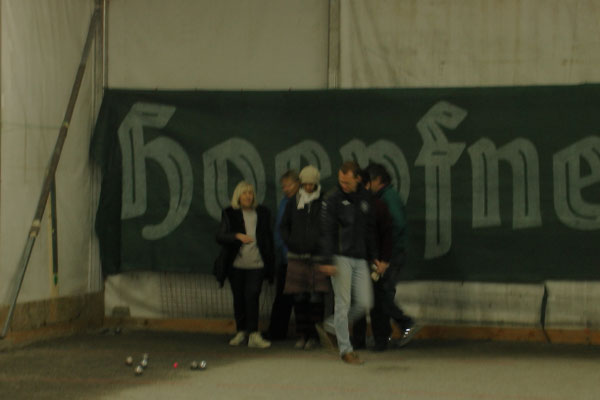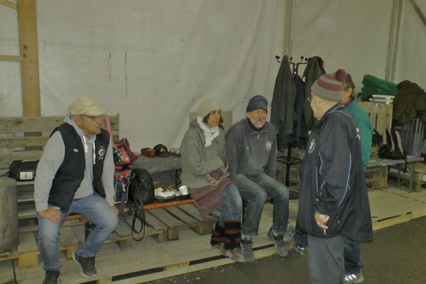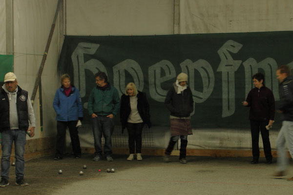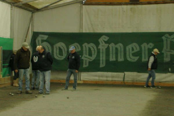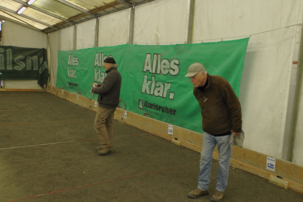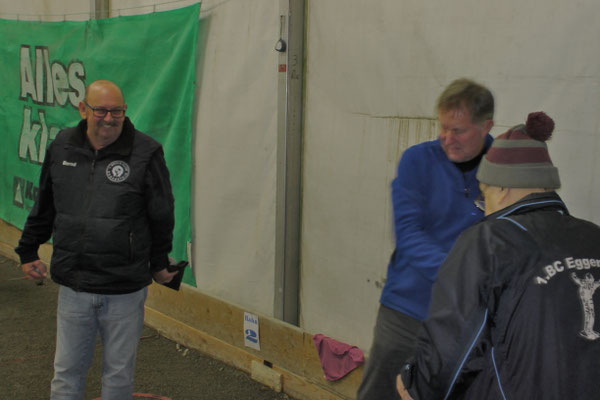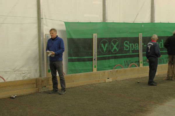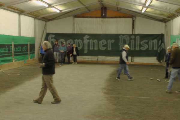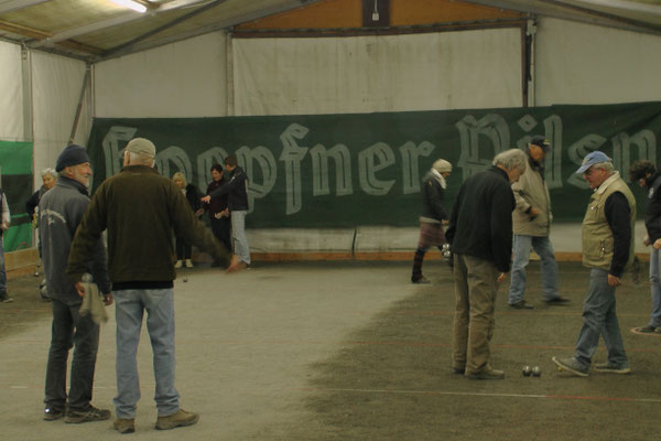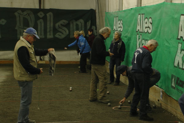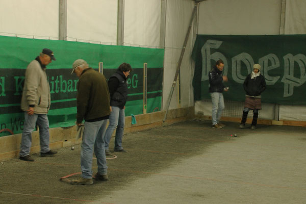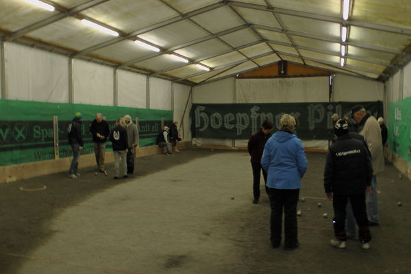 Ein Kuchenbuffet, das vom Butterkuchen über Stollen bis zum Dambedei alles bot, was zu den „Weihnachtssünden“ gehört, war im Boulodromzelt aufgebaut. Der Turnierleiter des Winterturniers Stephan Bothur war erfreut, daß sich unter den 25 Aktiven 9 Damen befanden. Die Teilnehmer aus der Freizeitgruppe machten den Liga-Spielern gehörigen Druck. In den 4 frei gelosten Vorrunden brachte das Losglück meistens ein Team aus FreizeitspielerInnen und LigaspielerInnen zusammen. So gab es spannende Begegnungen.