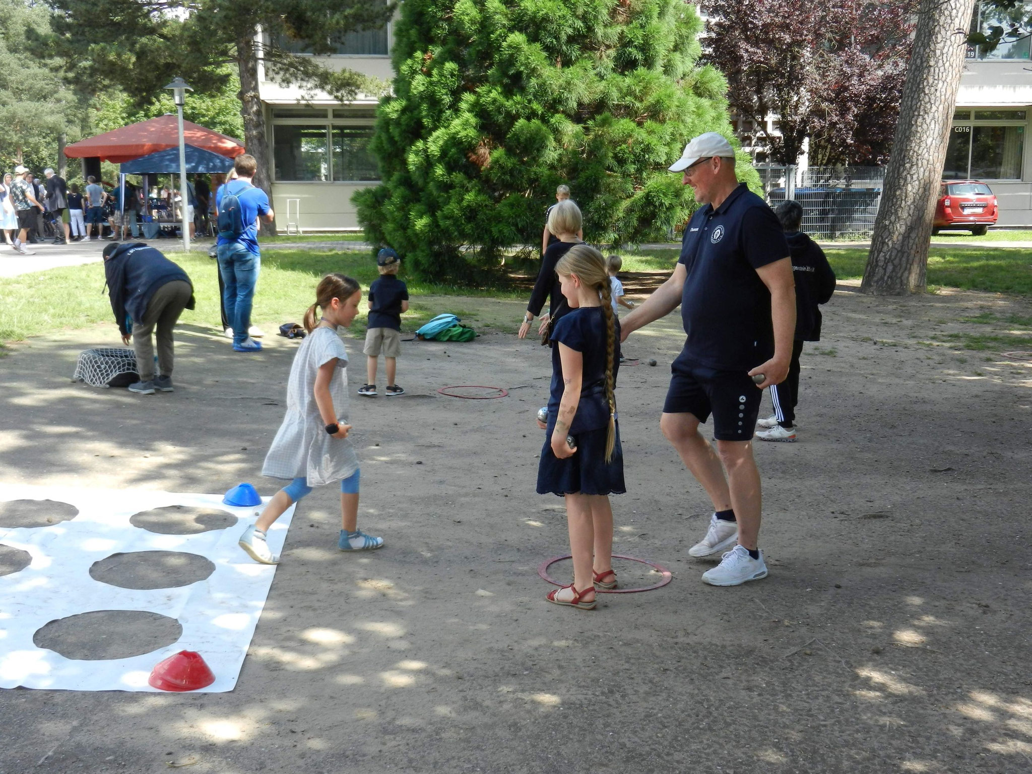 menschliche Werte zu vermitteln. Alles Ziele, die wir auch im Boulesport vermitteln möchten. Was lag also näher, als das Angebot der Schule zu nutzen und sich am diesjährigen Sommerfest zu beteiligen. Vermittelt durch einen Lehrer hatten Mitglieder der Wilden 13 und des BC Eggenstein am Samstag, den 23. Juni, 6 Stationen aufgebaut, an denen die Jugendlichen ihr Geschick im Umgang mit den Kugeln beweisen konnten. Unterstützt durch unsere Jugendlichen konnten wir