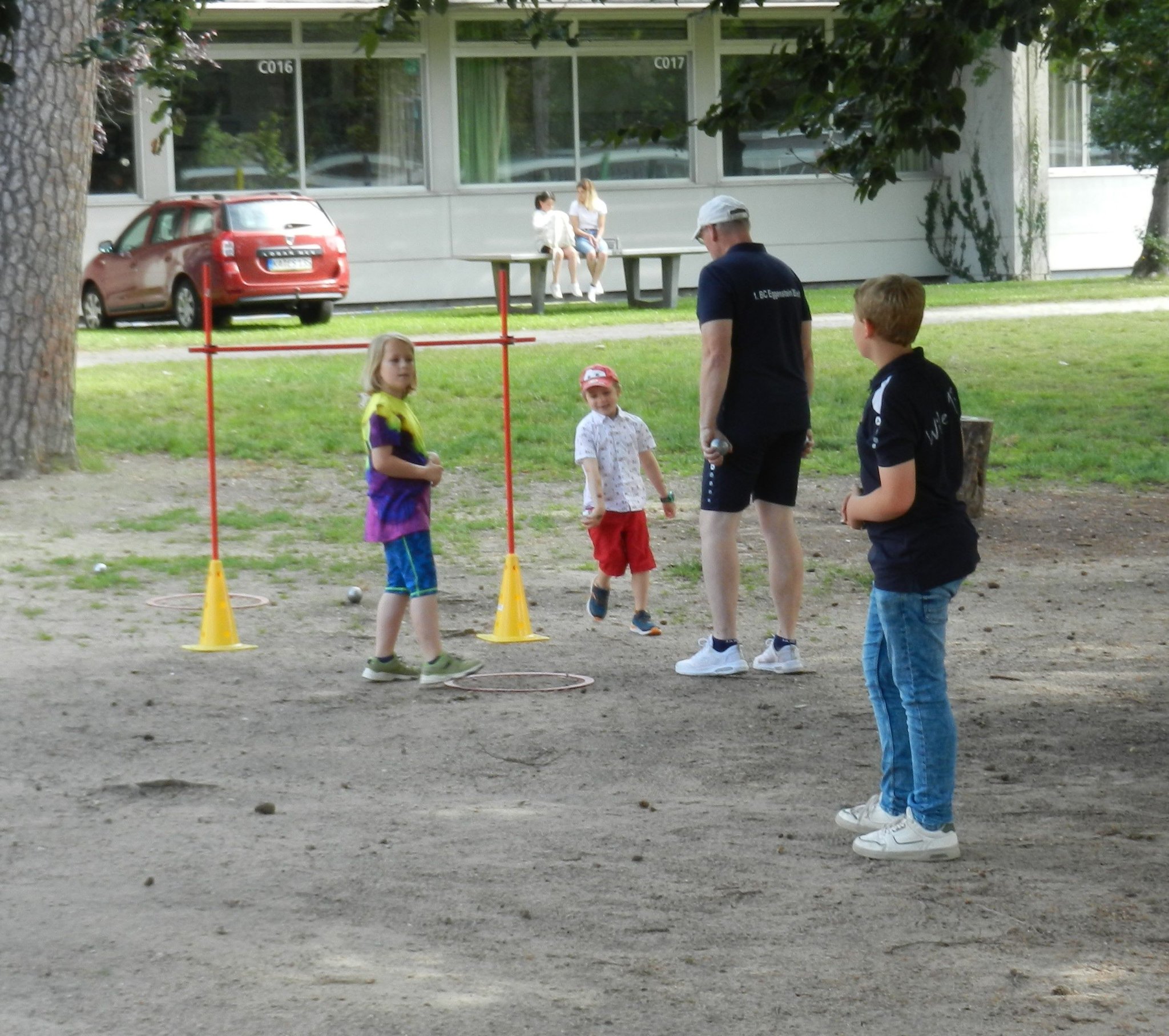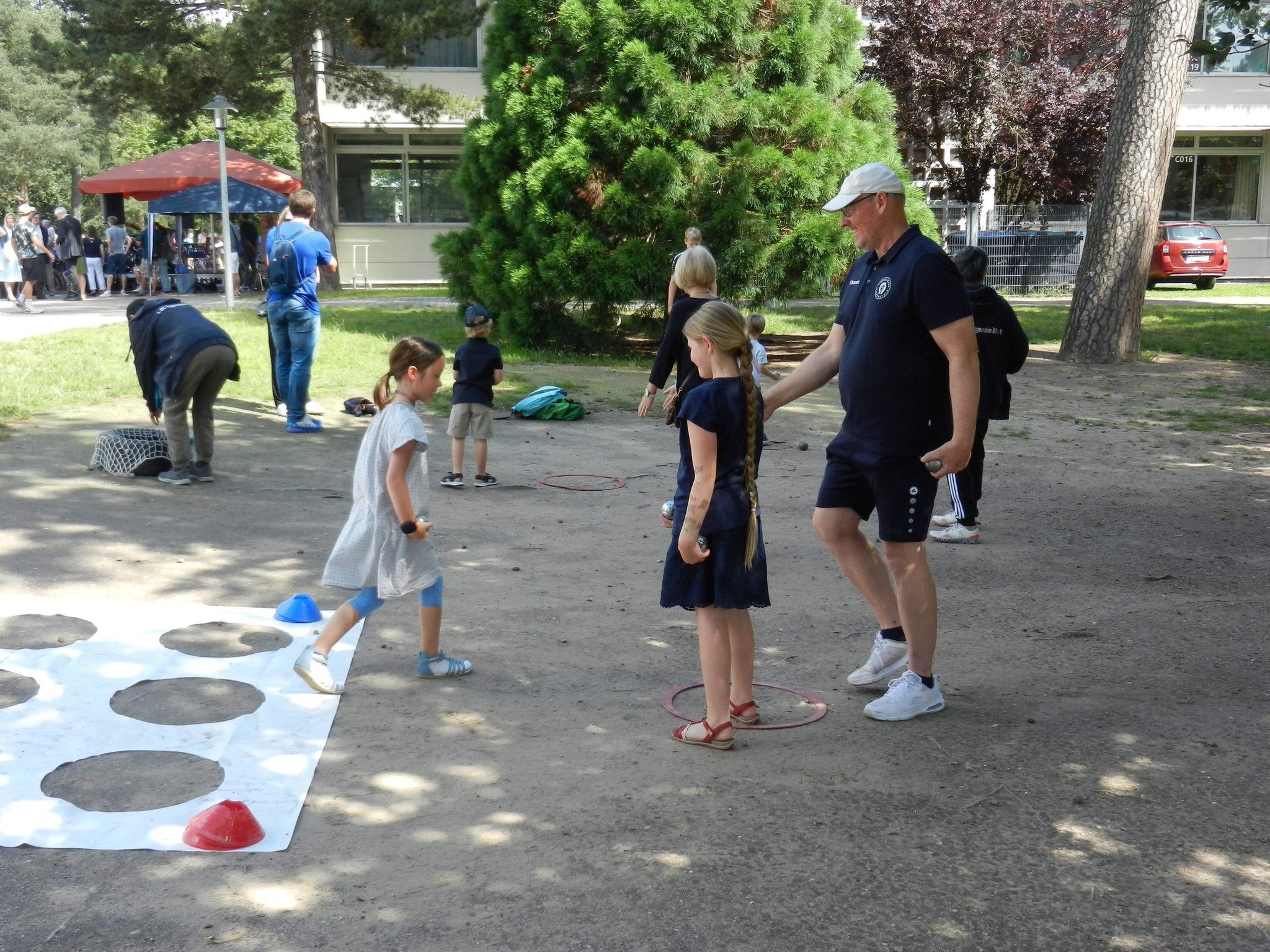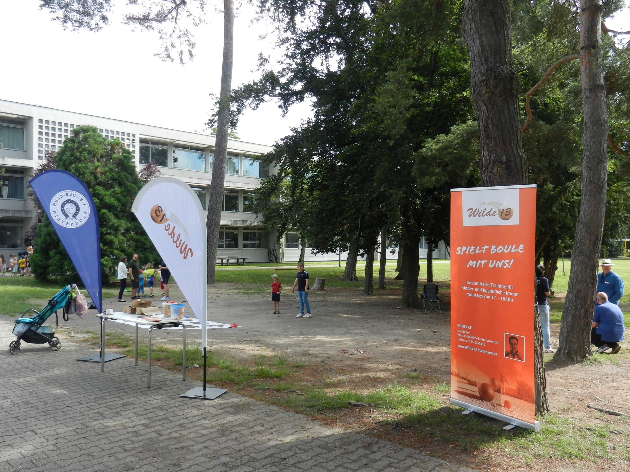 menschliche Werte zu vermitteln. Alles Ziele, die wir auch im Boulesport vermitteln möchten. Was lag also näher, als das Angebot der Schule zu nutzen und sich am diesjährigen Sommerfest zu beteiligen. Vermittelt durch einen Lehrer hatten Mitglieder der Wilden 13 und des BC Eggenstein am Samstag, den 23. Juni, 6 Stationen aufgebaut, an denen die Jugendlichen ihr Geschick im Umgang mit den Kugeln beweisen konnten. Unterstützt durch unsere Jugendlichen konnten wir