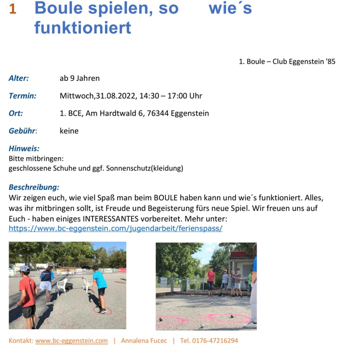 Im Rahmen der diesjährigen Ferienspaß-Aktion hatten sich 18 Kinder beim BC Eggenstein angemeldet um das Boulespielen kennenzulernen. Am 25.August begrüßte die Jugendsportwartin, Annalena Fucec, des Vereins die Kinder und gab eine kurze Einführung in den Boulesport. Anschließend wurden einige Ateliers mit Lege- und Schiessübungen aufgebaut, die die Kinder in Gruppen durchlaufen haben. Die Jugendspielerinnen des 1.BCE Annika, Katharina und Lara standen den Kindern zur Seite, erklärten und halfen.