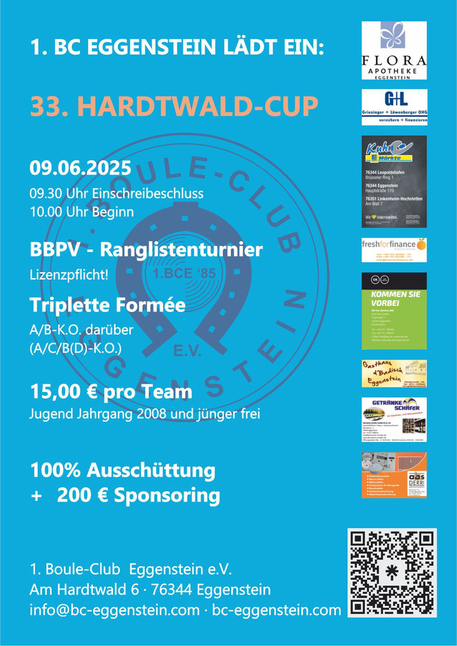 Am Pfingstmontag fand der 33. Hardtwald-Cup des 1. BC Eggenstein statt – erneut bei bestem Boulewetter und mit einer beeindruckenden Teilnehmerzahl: 90 Tripletten kämpften auf dem Eggensteiner Boulodrom um den Turniersieg.